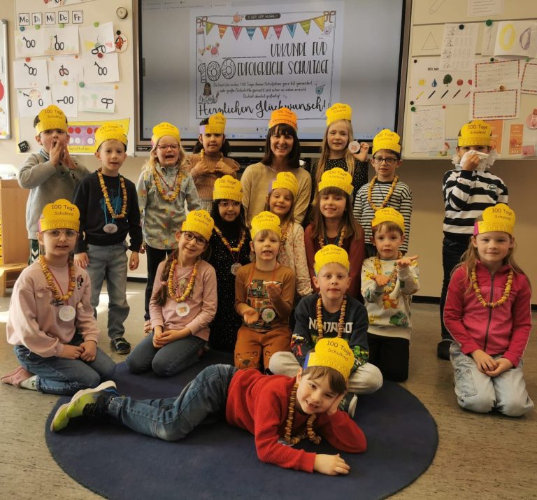 Die Erstklässler feierten ihren 100. Schultag mit verschiedenen Aktivitäten. Mit viel Freude wurde gezählt, gebastelt und gespielt – ein besonderer Tag für alle Kinder.