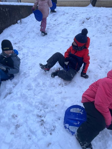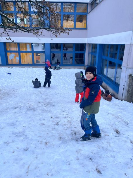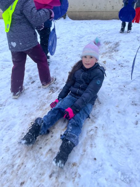 Noch vor Unterrichtsbeginn holten die Kinder schnell die Schneerutscher heraus und nutzten den Schnee, bevor er schmilzt. Mit viel Freude starteten sie so in den Schultag.