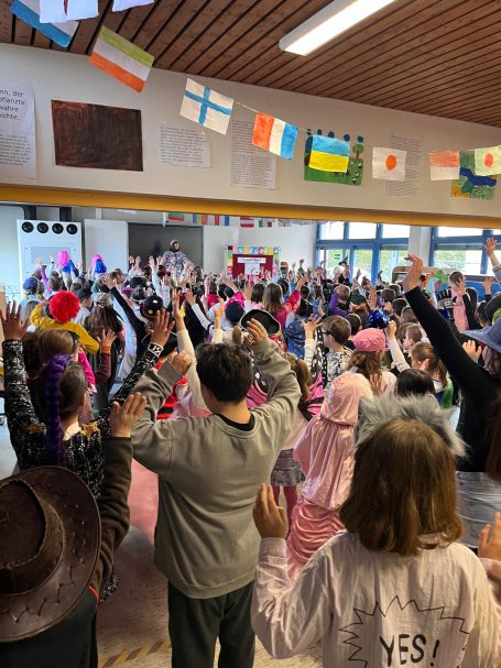 Alle Klassen starteten bunt verkleidet mit einer Polonaise durch die Schule. In der Aula wurde gemeinsam getanzt, anschließend feierten die Klassen in ihren Klassenzimmern weiter.